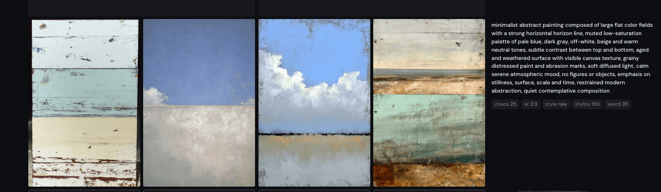 I began by curating and refining a set of abstract references, removing anything decorative or trend-driven. The remaining works shared muted palettes, horizontal field-based compositions, visible texture, and a quiet emotional register.